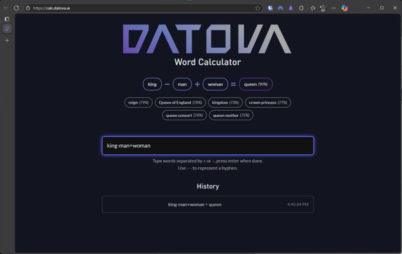 Es una aplicación (“Semantic Calculator”) que permite hacer operaciones con palabras (no con números), usando vectores semánticos. Por ejemplo: