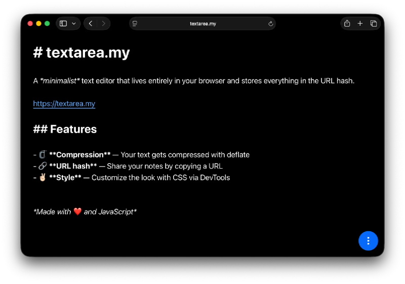 textarea.my es un editor minimalista sin servidor, sin base de datos, sin cuenta. Todo lo que escribís se comprime con deflate y se almacena directamente en el hash de la URL.